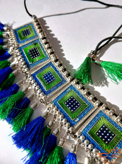 Колье "Квадрати"з китицями, ,ємаль сине-зел. белий метал. Індія