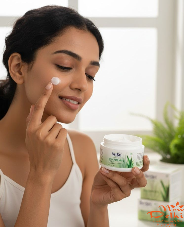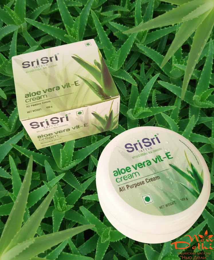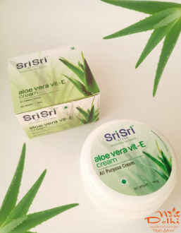 Універсальний крем Sri Sri Aloe Vera Vit-E створений на основі натуральних екстрактів алое віра, огірка та мигдальної олії, доповнених вітаміном Е. Засіб забезпечує глибоке зволоження, живлення та захист шкіри, підходить для повсякденного використання та для всіх типів шкіри.