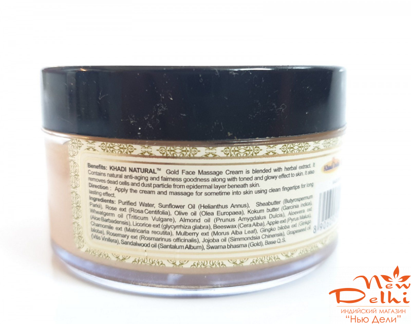 Золото покращує циркуляцію крові, зміцнює еластичність шкіри, оновлює клітини шкіри, має антиоксидантні властивості. Масажний крем чудово підходить для повноцінного масажу обличчя та для екстра-догляду, коли можна використовувати його як маску протягом 10-15 хвилин.