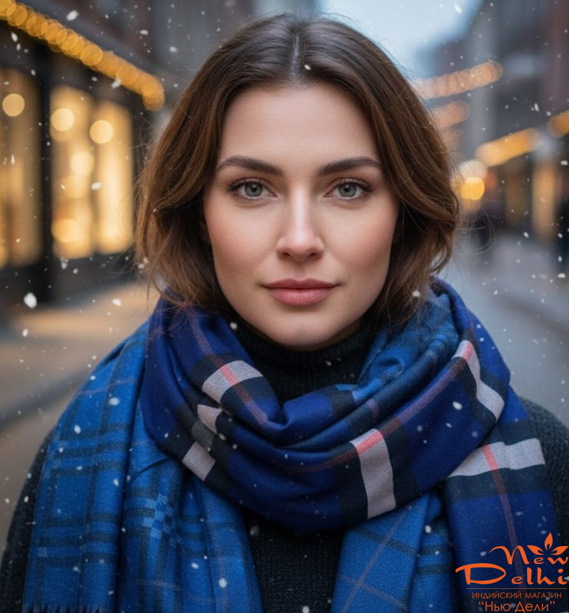 О продукте Теплий широкий шарф-Палантин "Клітинка" кашемир , синий.