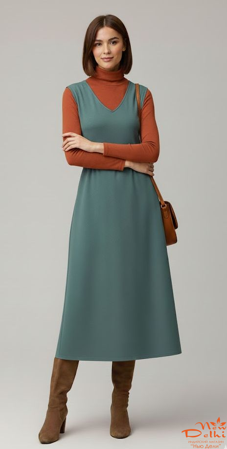 Ідеальний для багатошаровості: Сарафан чудово поєднується з тонкими водолазками (гольфами), класичними блузами або об'ємними жакетами.